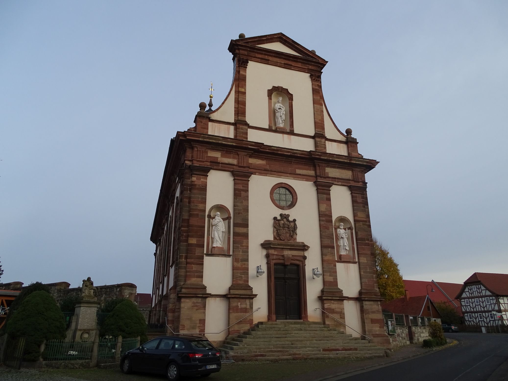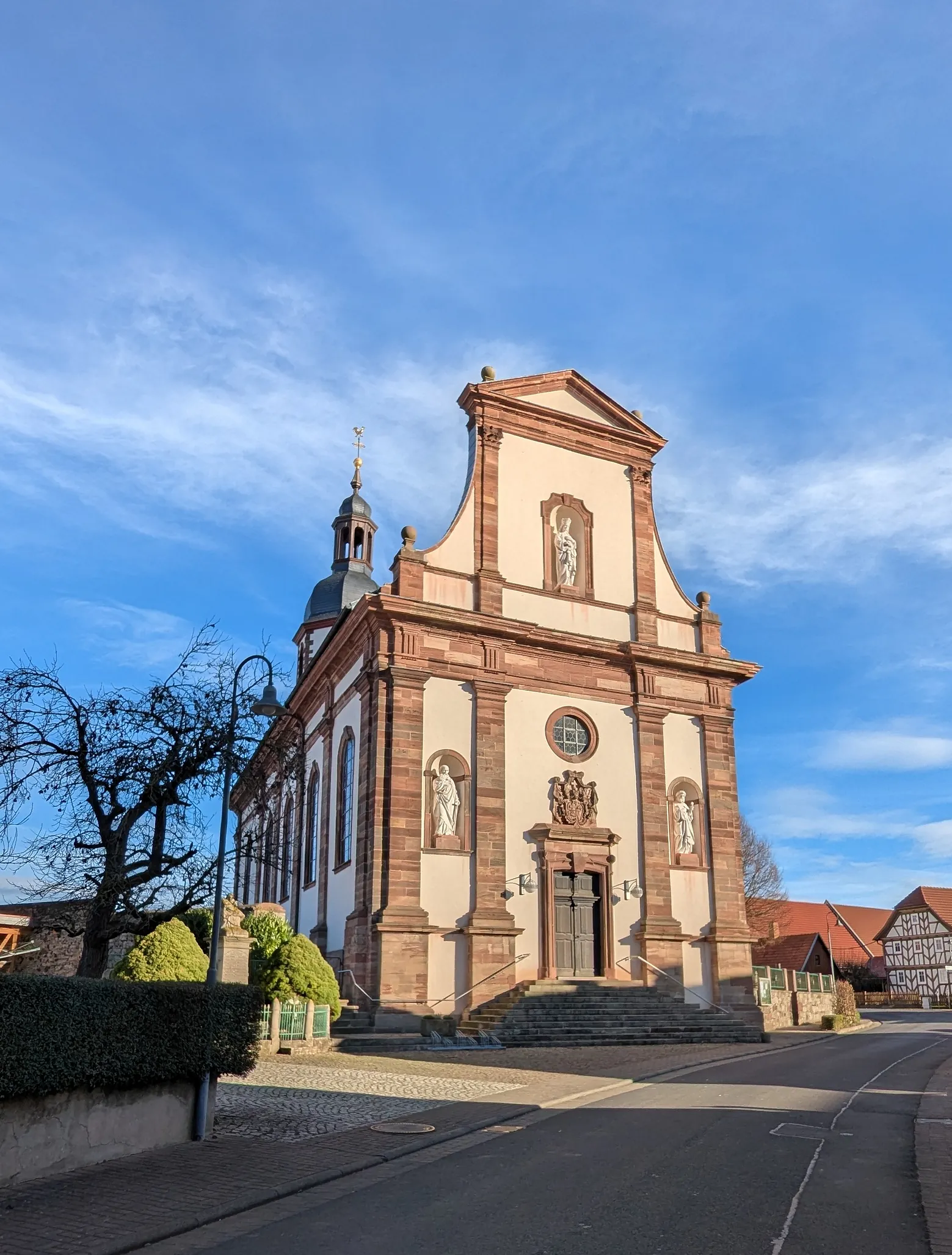 - Die Kirche wurde 1743–1746 nach einem Entwurf von Andrea Gallasini erbaut, der auch die Kirchen in Dermbach und Zella entworfen hat. Dabei wurde ein mittelalterliches Turmuntergeschoss mit einbezogen. Die Kirche hat eine zweigeschossige Fassade mit einem Wappenstein des Fuldaer Fürstabts Amand von Buseck und Figuren der Apostel Petrus und Paulus. Der Turm hat eine welsche Haube und enthält die Sakristei.